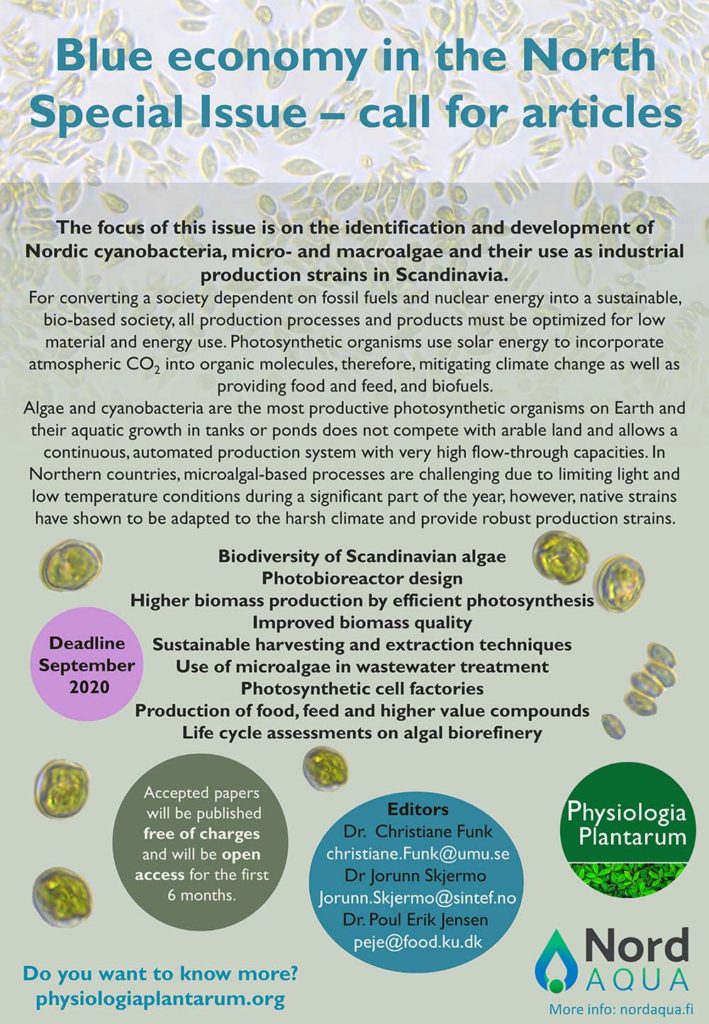 For converting a society dependent on fossil fuels and nuclear energy into a sustainable, bio-based society, all production processes and products must be optimized for low material and energy use. Photosynthetic organisms use solar energy to incorporate atmospheric CO2 into organic molecules. Therefore, photosynthesis not only mitigates climate change, the produced biomass also provides food and feed, and even can be used in technical processes to gain valuable products and biofuels. Algae and cyanobacteria are the most productive photosynthetic organisms on Earth. Their fast growth allows harvesting after short times and the aquatic growth of microorganisms in tanks or ponds does not compete with arable land and allows a continuous, automated production system with very high flow-through capacities. Therefore, the interest is enormous in the development of algal-based bioeconomy and bioproduction value chains, and research on blue bioeconomy is progressing rapidly on a global scale. In Northern countries, microalgal-based processes are challenging due to limiting light and low temperature conditions during a significant part of the year, however, native strains have shown to be adapted to the harsh climate and provide robust production strains. Additionally, in Nordic climate evaporation or over-heating are minimal. Cutting-edge Nordic research on algal technology, innovation and entrepreneurship is performed within the private and public sector.